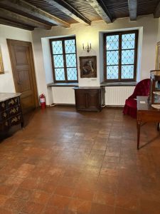 Pardoselile interioare sunt acoperite cu lemn (parchet) la etaj, iar la parter cu plăci ceramice neglazurate, așezate în linie, ceea ce pare o soluție fericită. Parterul nu este foarte înalt, iar nivelul pardoselii lui este ușor sub nivelul solului curții, deși atunci când clădirea a fost pregătită să devină muzeu s-a încercat revenirea la nivelul de călcare original. Aceasta face ca parterul să semene oarecum cu un demisol înalt, deci umiditatea poate deveni o problemă pentru pardoselile sensibile la apă. Deseori la clădirile foarte vechi apare o problemă privitoare la nivelul solului în raport cu planul pardoselii; pe de o parte, clădirea se ”scufundă”, iar pe de alta nivelul solului se ridică prin acumulări continue. De-a lungul secolelor, cotele zonelor locuite se ridică de la resturi din gospodărie sau de la vegetație, adaos de pământ pentru amenajare, resturi din demolări sau incendii, praf din eroziune etc. Un caz evident este de exemplu Biserica Sf. Gheorghe Nou din centrul Bucureștiului, care în cele trei secole de existență a rămas cu 60 – 70 cm mai jos decât nivelul terenului înconjurător, în bună măsură din cauza resturilor de la incendiul din 1847, când a ars în întregime Hanul Sf. Gheorge din apropiere. În cazul Casei Melik, este vorba de doar 30 cm.
