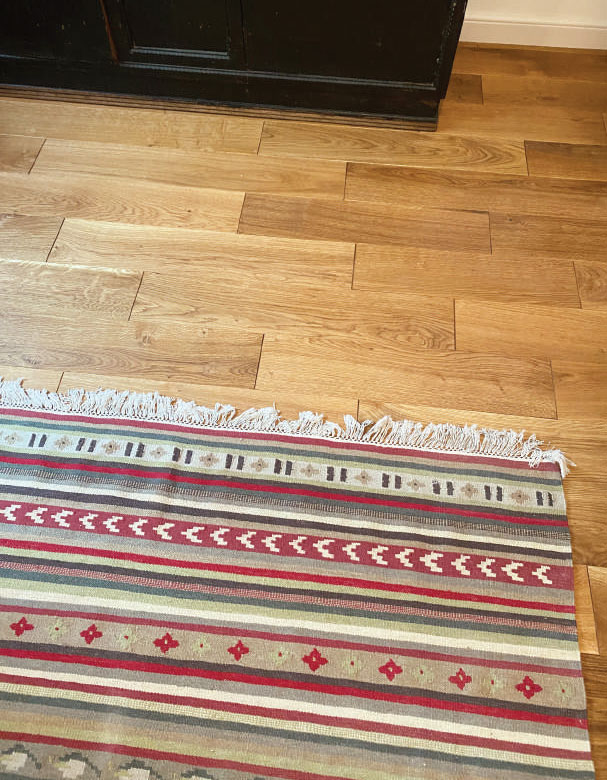 La final, lemnul a fost acoperit cu ulei incolor Magic Oil 2 K de la Pallmann, un produs bi­component care are proprietatea de a crea o suprafață mată, ușor catifelată, care respinge apa și murdăria. În plus, este un ulei care se usucă rapid și are emisii reduse de VOC. La montajul parchetului, a lucrat o echipă de 3 sau 4 muncitori timp de 4 zile, plus încă o zi pentru finisare. După ce au fost executate pardoselile din lemn la cele două niveluri, s-a trecut la amenajarea scării de beton armat, care a fost placată cu trepte și contratrepte de stejar masiv și i s-a montat o balustradă din același material. Piesele din lemn au fost realizate în atelier, după un design ales de client, în circa 2 săptămâni. Montajul pe poziție a mai durat timp de încă 4 zile, dar mare parte din timp a fost alocat ele­mentelor de detaliu.