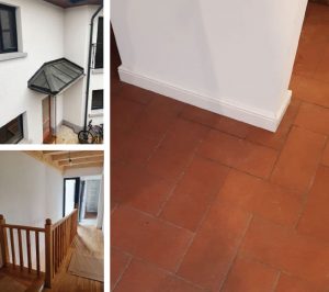 Dar montajul ceramicii nu a fost singura provocare; dorința beneficiarilor a fost ca între pavaj și dușumeaua de lemn trecerea să se facă la același nivel, cu rosturi minime, fără niciun profil. Astfel, grosimile celor două tipuri de acoperiri fiind diferite, a trebuit gândită foarte bine grosimea șapelor.
