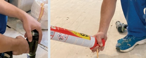 Astfel, pe zonele cele mai afectate se practică câteva găuri cu un burghiu de lemn și în spațiile rezultate se introduce spumă poliuretanică. E important să ajungeți cu burghiul sub substructură, nu doar sub parchet. Ideea este ca spuma să creeze o masă compactă împiedicând substructura să joace. Se impune însă să lucrați foarte atent mai ales dacă știți că prin pardoseală există trasee de instalații, pentru a evita spargerea acestora, ceea ce echivalează cu un mic dezastru. În fine, dacă ați practicat gaura și ați introdus spuma, repetați acest procedeu la fiecare zonă care joacă, închizând apoi orificiul cu un cep de lemn. Există lucrări unde au fost realizate sute de atare găuri pe suprafață, poziția lor fiind aleasă așa încât să formeze un model estetic, mai ales la pardoseli foarte vechi unde nu s-a dorit însă decopertarea completă.